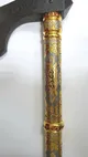 Корпус топора выполнен из дамасской стали, известной своей прочностью и исключительной красотой. Острое лезвие, надежно удерживаемое в рукояти, гарантирует безупречную функциональность. Рукоять изготовлена из благородного дерева, подчеркнута элементом декора из латуни, покрытой позолотой, и украшена натуральными гранатами, что придает изделию неповторимый вид.